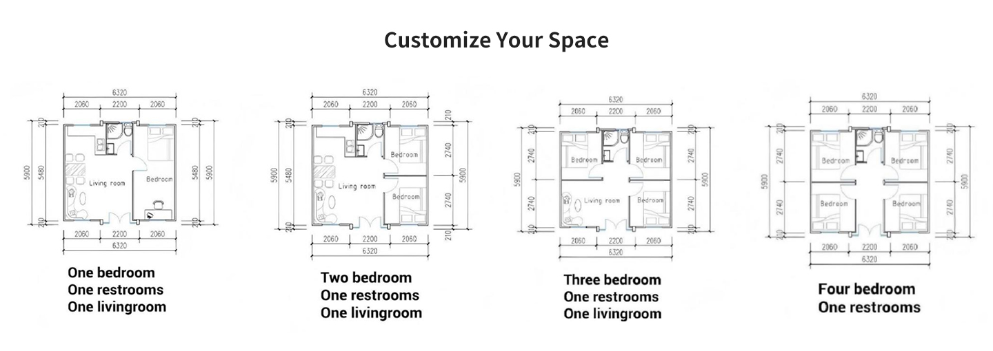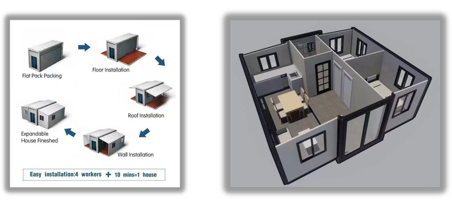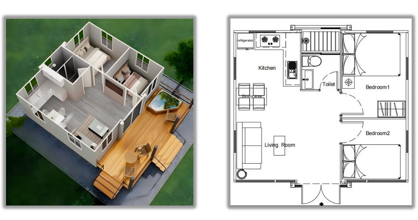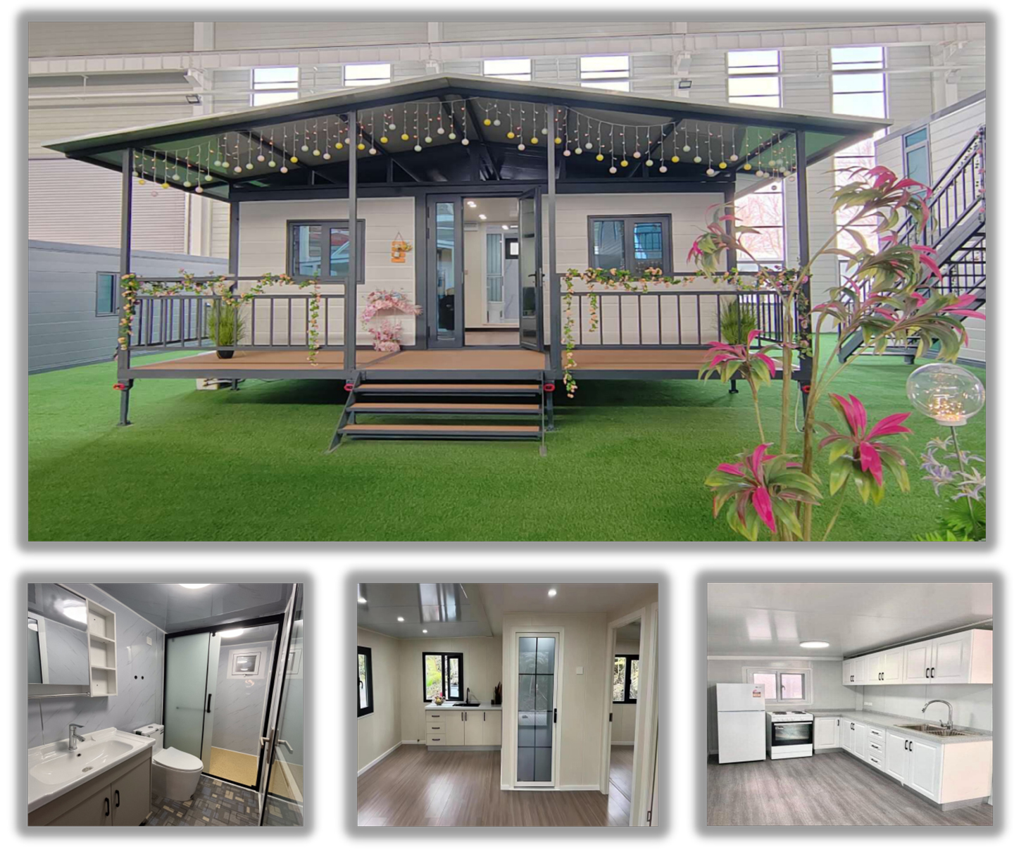 Ce modèle convient à la famille de 3-5 personnes et peut fournir aux clients une expérience de vie confortable. Le logement intérieur est entièrement équipé et le système d’eau et d’électricité est préfabriqué. La disposition de pièce et la couleur de mur extérieur soutiennent la personnalisation.